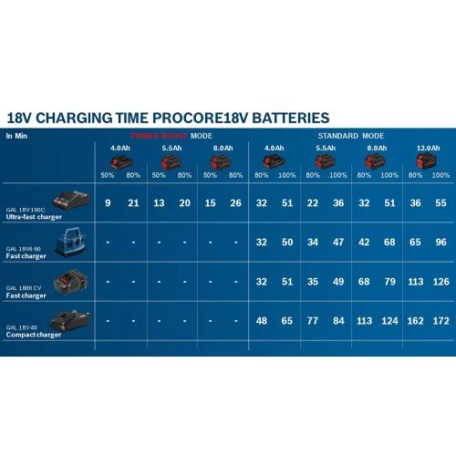 Equipée de la technologie coolpack, les batteries Procore Bosch dissipent mieux la chaleur lors d’une utilisation intensive. Cela a pour effet de ralentir la surchauffe de celle-ci, et donc de prolonger sa durée de vie. De plus, les batteries Procore permettent de délivrer plus de puissance à la machine. Combinées à la technologie Biturbo, elles permettent d’atteindre des niveaux de puissance équivalent au filaire, jamais égalées auparavant sur des machines. Elles sont compatibles avec toutes les machines de la gamme 18V professionnelle.