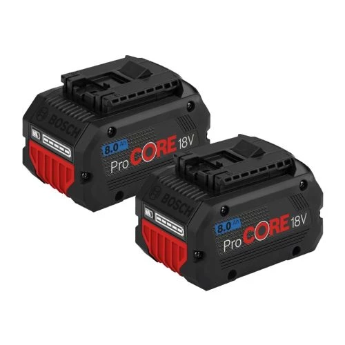 Ce pack se compose de 2 batteries Bosch ProCore 18 V – 8,0 Ah Li-Ion Professional. Les batteries Bosch ProCore 18 V – 8.0 Ah Li-Ion Professional possèdent une performance équivalente à une puissance filaire de 1 800 W.