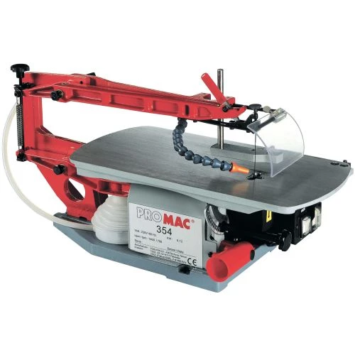 Ce scie à chantourner Promac dispose de moteur 2 vitesses pour la coupe de divers matériaux avec table inclinable de 90°- 45°, protection contre les copeaux, adaptateur pour aspiration , système de souffl erie des poussières , dispositif de changement rapid des lames.