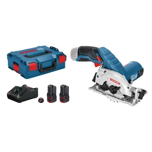 Ce pack est composé d’une scie circulaire sans-fil GKS 12V-26 Professional 12 V, de 2 batteries GBA 12V 2 Ah, d’un chargeur GAL 12V-40 Professional et d’un coffret L-BOXX 136.