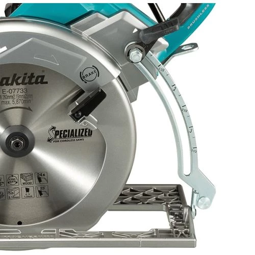 Cette scie circulaire 40 V de la marque Makita est dotée d’un système de technologie XPT pour protéger l’outil contre l’infiltration de la poussière et de l’eau. Et du système AWS (Auto-start Wireless System) pour connecter à des aspirateurs compatibles avec Bluetooth. Elle est dotée d’un moteur Brushless, et possède un interrupteur de sécurité. Son démarrage progressif assure un démarrage en douceur de la machine (sans à-coups) pour plus de sécurité. Elle est équipée d’un frein électrique et une poignée Soft Grip.