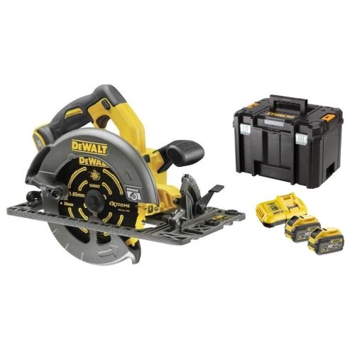 Ce pack se compose d’une scie circulaire sans-fil XR Flexvolt DCS576NT 54 V, de deux batteries XR Flexvolt 6 Ah, d’un chargeur rapide et d’un coffret de transport T-Stak.