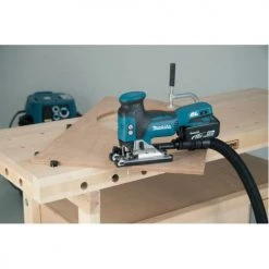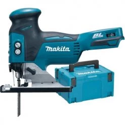 Cette scie sauteuse sans-fil de la marque Makita bénéficie d’un moteur sans charbon. Avec 6 plages de réglages de la vitesse, cet outil offre un travail optimal sur différents matériaux. Elle dispose d’un système de changement de lame sans outils rapide et résistant. Cette machine est dotée d’un mouvement pendulaire à 3 positions + 1 droite pour assurer une coupe plus nette. Sa fonction éclairage incorporée garantit un travail plus aisé dans les endroits sombres. Grâce au bouton de sécurité, la scie prévient à l’activation accidentelle de la gâchette. De plus, la base en aluminium rigide inclinable à gauche et à droite à 45° assure une plus grande précision de coupe. Dans les courbes, l’axe de coupe à profil carré offre plus de précision.